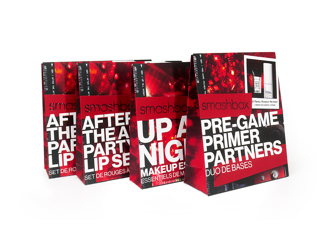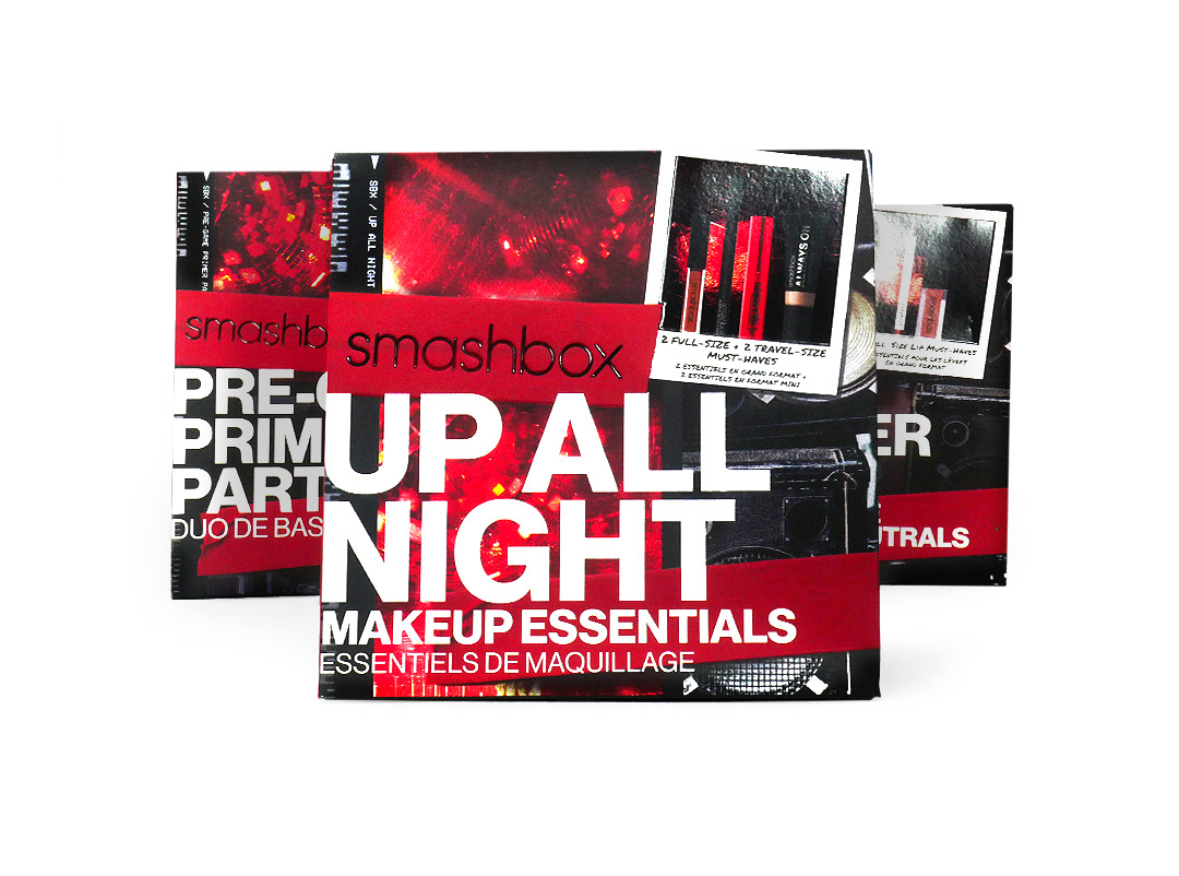 ART DIRECTION // PACKAGING DESIGN The goal of the design was to convey "party-proof" makeup. Makeup that will last all night. Inclusive to the festive visuals was a quick-open perforated pull tab.